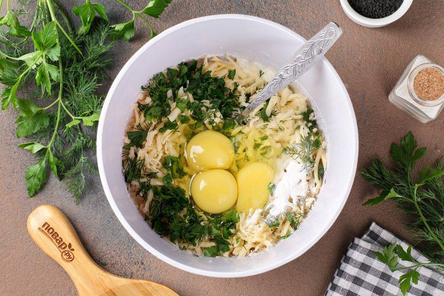 Добавьте измельчённую зелень, тёртый сыр, соль, разрыхлитель и яйца.