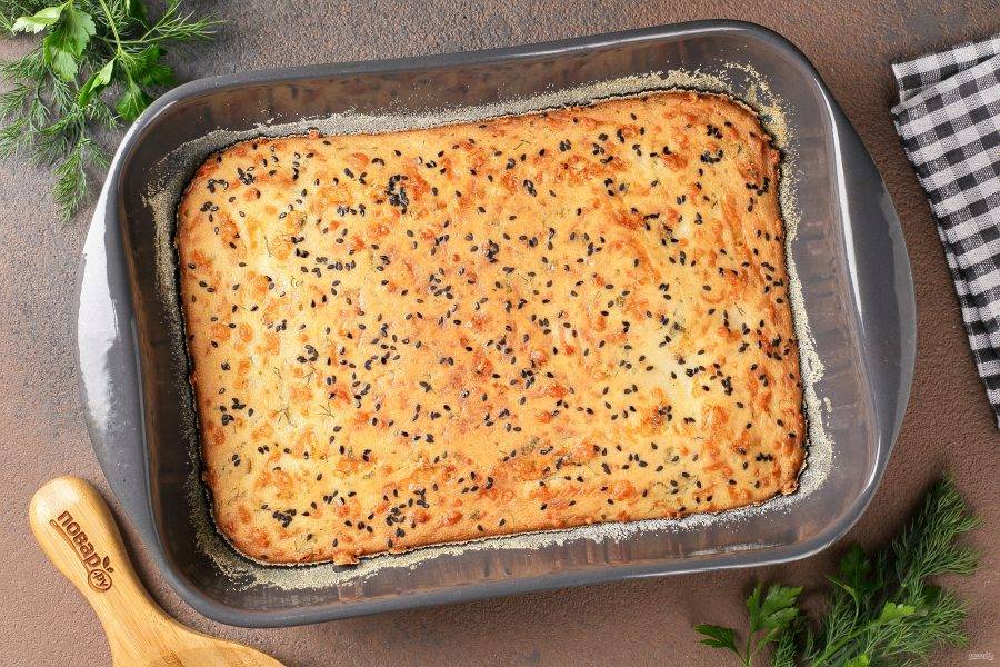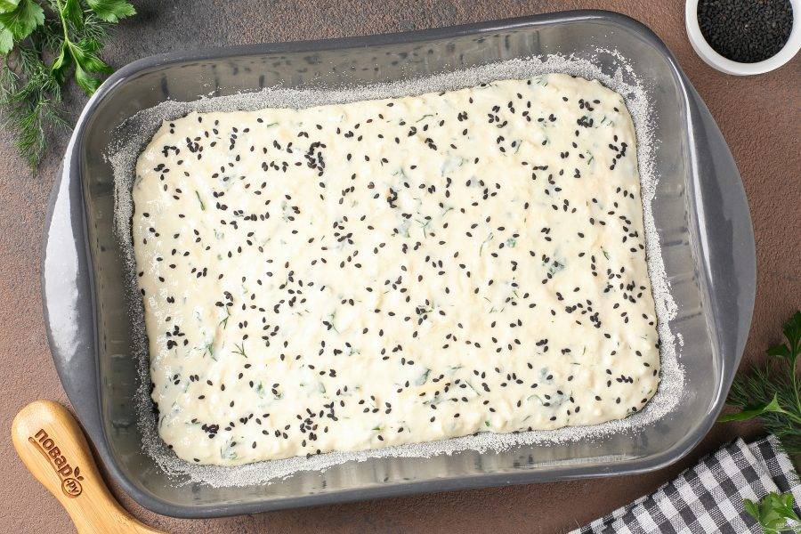 Жаропрочную форму смажьте маслом и присыпьте манкой. Выложите тесто и разровняйте лопаткой. Посыпьте тесто кунжутом. Выпекайте в духовке при температуре 180 градусов около 40 минут.