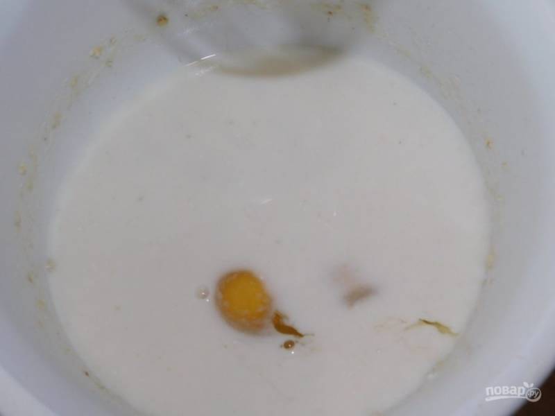 Затем влейте молоко и добавьте яйца, соду, растительное масло. Все хорошо перемешайте.