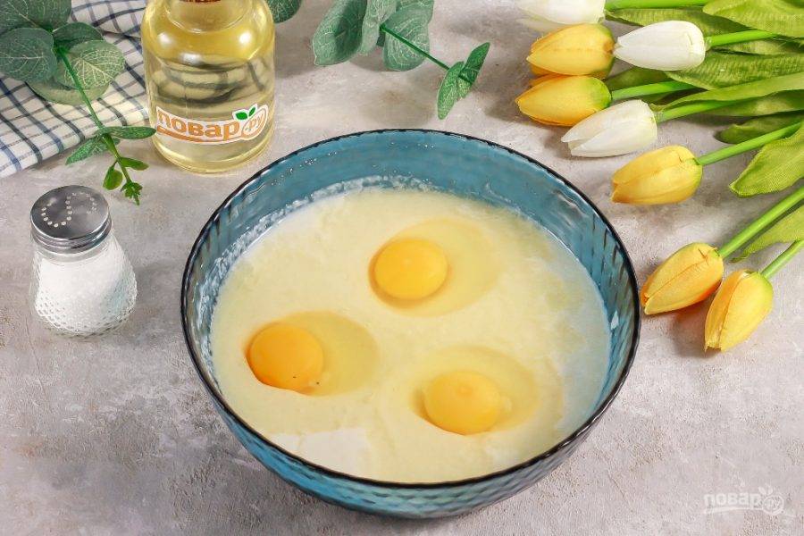 Спустя указанное время вбейте в емкость куриные яйца и взбейте.