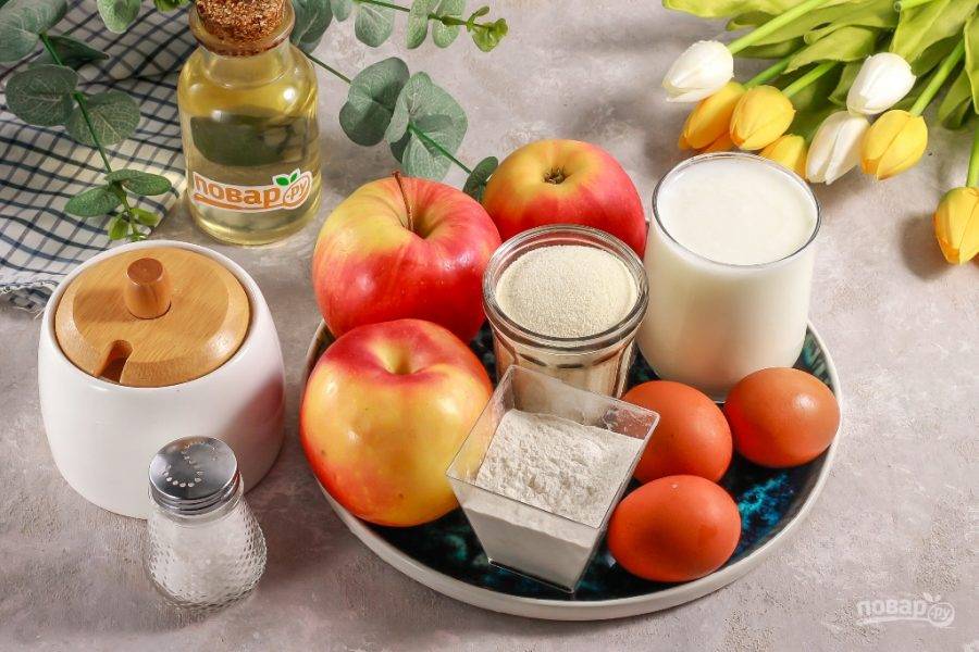 Подготовьте указанные ингредиенты. Если яблоки мелкие, то используйте 3 плода, если крупные, то два. То же самое и с куриными яйцами.