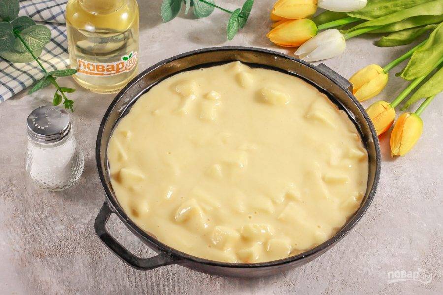 Разогрейте духовку до 180 градусов. Смажьте форму растительным или сливочным маслом, выложите в нее тесто с яблоками. Поместите форму в духовку на 25-30 минут.