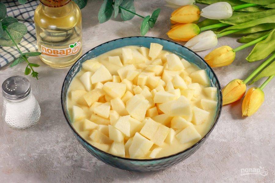 Яблоки любого сорта очистите от кожуры и промойте в воде. Разрежьте на части и срежьте семенные блоки. Нарежьте кубиками и добавьте в емкость с тестом. Аккуратно перемешайте.