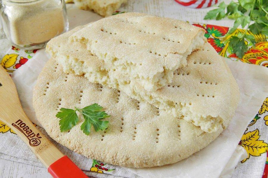 Стол посыпьте манной крупой и раскатайте на нем каждый кусок теста в форме лепешки, толщиной около 1 см. Переложите лепешки на противень и оставьте примерно на 20 минут, затем наколите их по всей поверхности вилкой.
