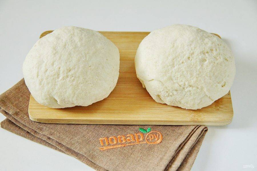 Подошедшее тесто необходимо обмять руками и разделить на две части.