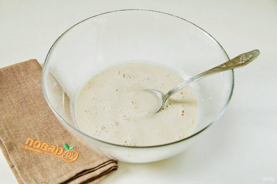 В глубокой миске соедините теплую воду, соль, сахар и дрожжи.