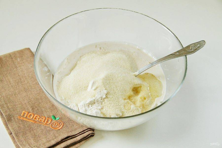 К полученной смеси добавьте муку, манку и оливковое масло.