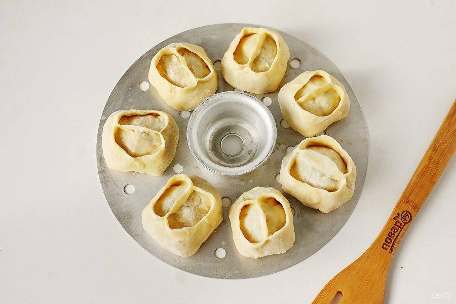 Решетку мантоварки или пароварки смажьте маслом и выложите манты. Готовьте манты на пару около 45 минут.