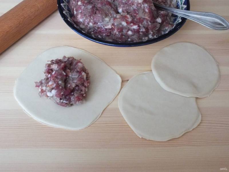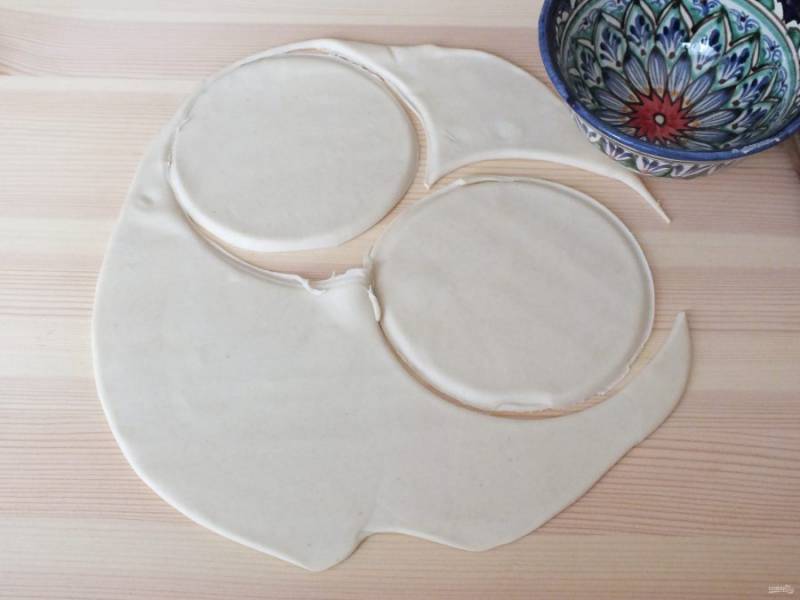 "Отдохнувшее" тесто готово к разделке. Отрежьте небольшой кусок, раскатайте и вырежьте круги в диаметре 11 см.