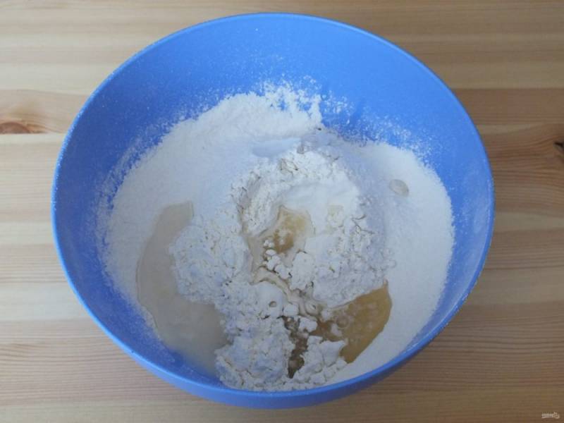 Просейте в чашу муку и влейте воду с маслом. Замесите тесто. Если оно будет липнуть к рукам, добавьте еще муки. Тесто не должно "плыть", оно должно быть упругим.