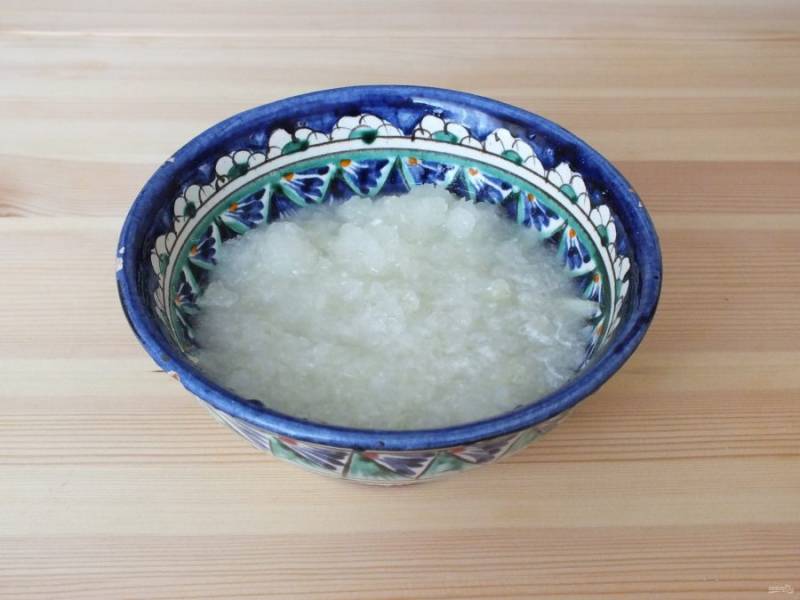 Подготовьте фарш. Измельчите лук на мясорубке с крупной решеткой, присолите и отставьте в сторону.
