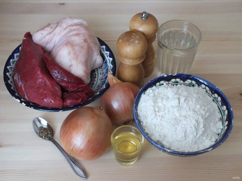 Смешайте лук и измельченное мясо с жиром. Добавьте зиру, черный перец, соль. Перемешайте.