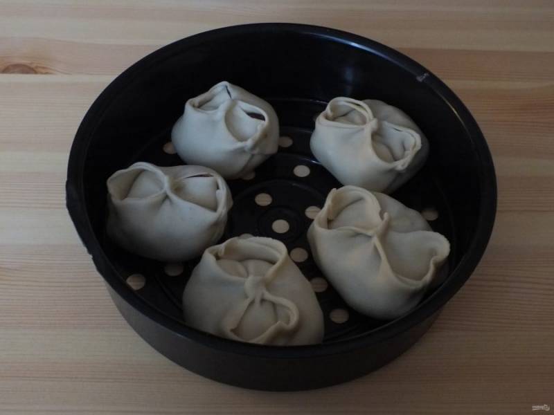 Возьмите чашу для пароварки и смажьте ее тонким слоем курдючного жира и выложите манты. Варите в пароварке в течение 40 минут после закипания воды.