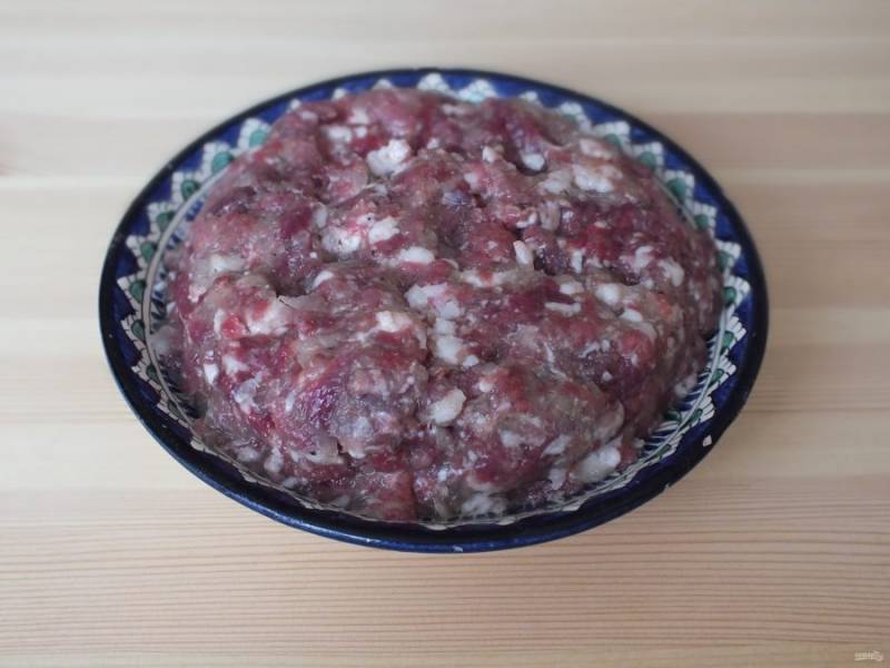 Говядину зачистите от пленок, сухожилий. Измельчите мясо и курдючный жир в ручную с помощью острого ножа или на мясорубке с максимально крупной решеткой.