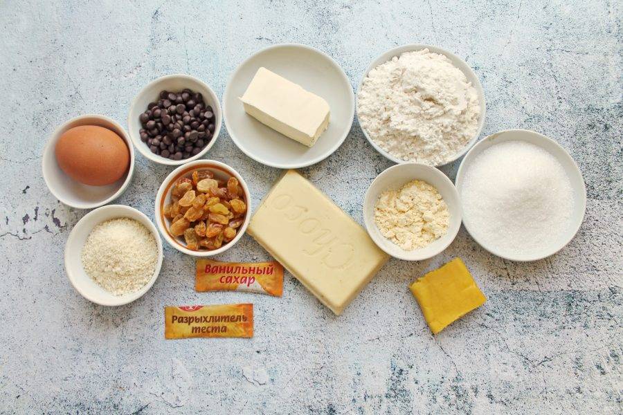 Подготовьте все необходимые ингредиенты для приготовления марципанового кекса.