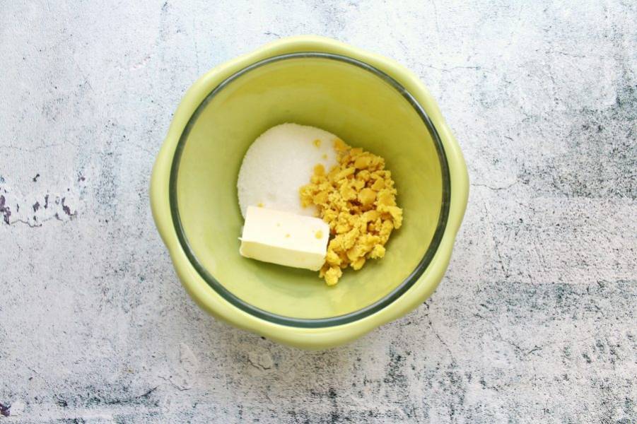 В миску выложите мягкое сливочное масло, добавьте сахар, ванильный сахар и раскрошите марципан. Все взбейте в пышную массу.