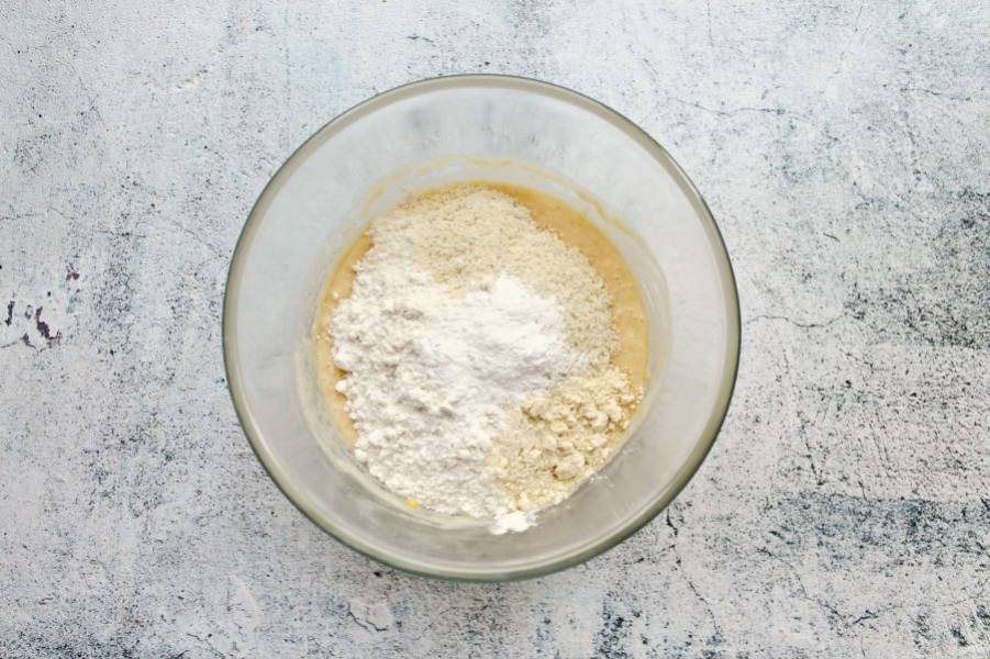 Смешайте пшеничную муку с разрыхлителем, добавьте в миску, добавьте миндальную и кукурузную муку.