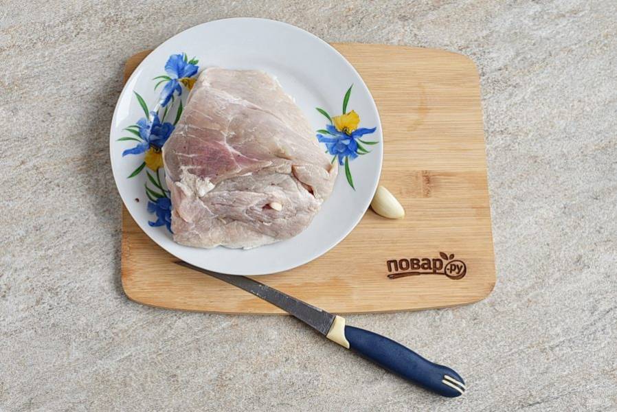 С помощью узкого длинного ножа нашпигуйте мясо зубчиками чеснока, разрезанными вдоль на несколько частей.