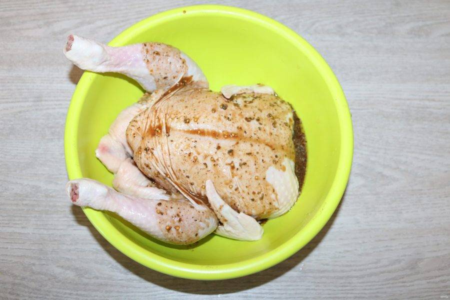 Хорошо распределите маринад со всех сторон. Накройте пищевой плёнкой. Отправьте цыплёнка в холодильник на 10-12 часов, чтобы он хорошо замариновался. За это время нужно перевернуть и обмазать цыплёнка стёкшим маринадом ещё раз.