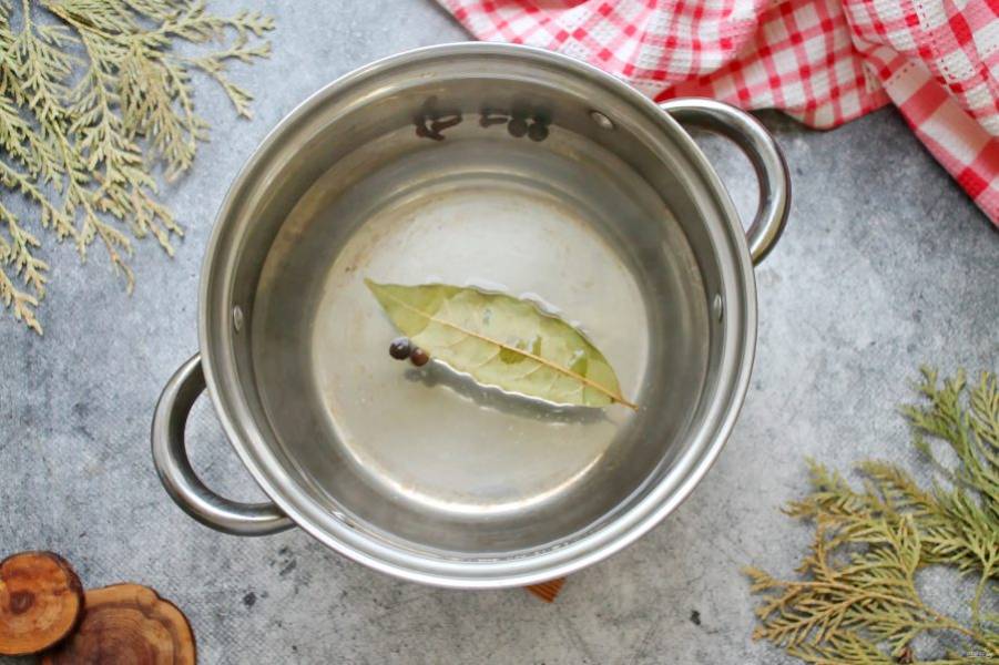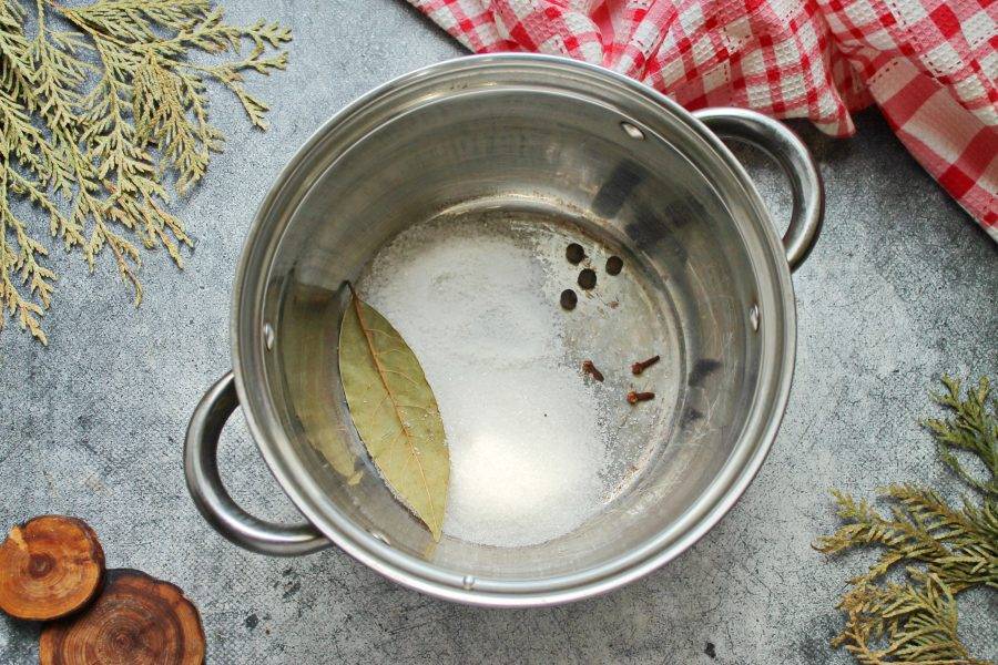 В кастрюлю выложите соль, сахар, перец, лавровый лист и бутончики гвоздики.