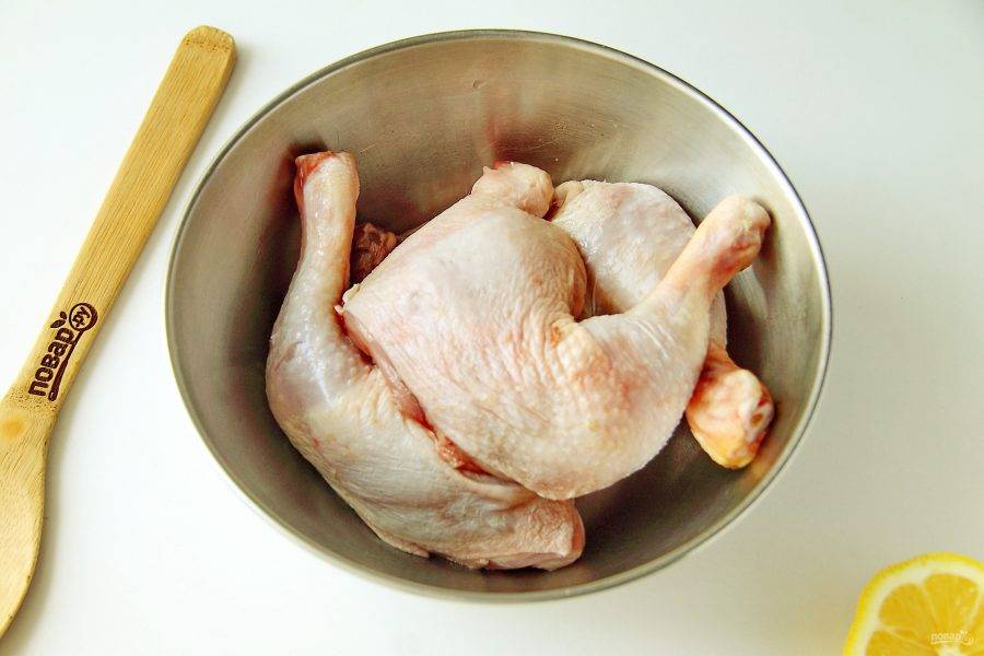 Окорочка если необходимо разморозьте при комнатной температуре, промойте под проточной водой и обсушите бумажным полотенцем.