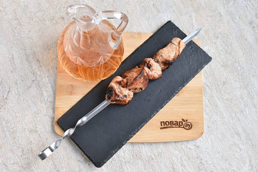 Далее как обычно, нанизайте мясо на шампуры и жарьте над хорошо прогоревшими углями.