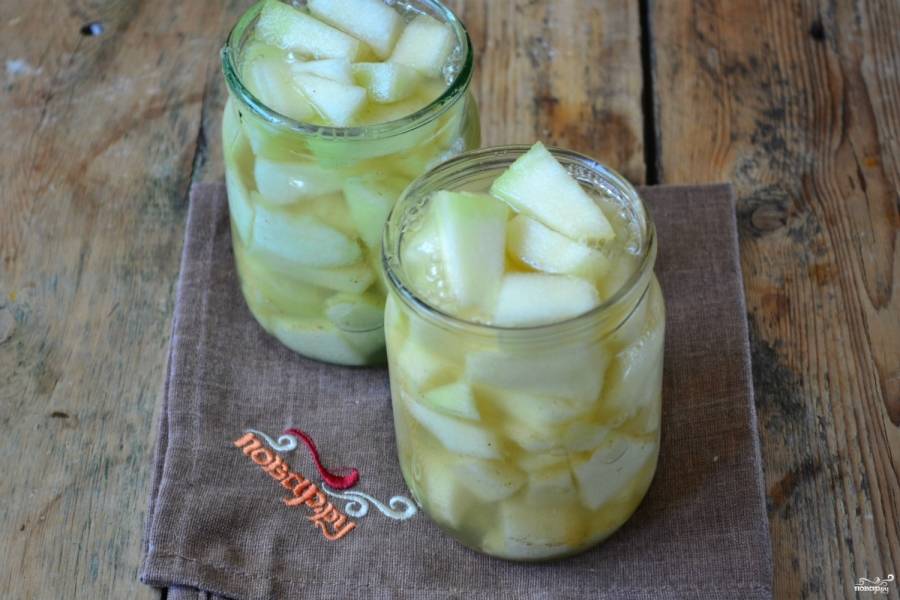 Пока будет закипать маринад, сложите плотненько в чистые сухие банки кусочки дыни. Затем залейте их горячим маринадом.