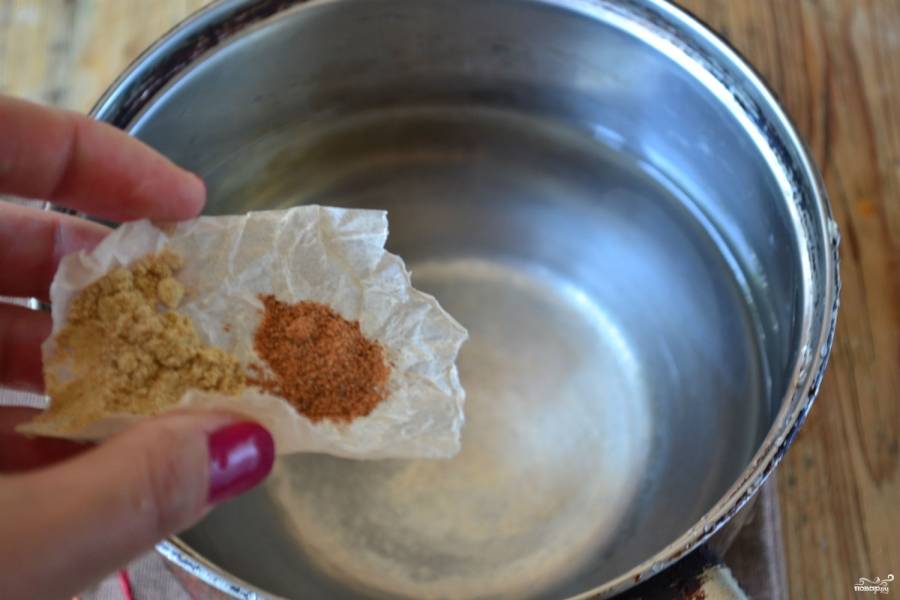 Приготовьте маринад. Для этого в холодной воде полностью растворите мед. Добавьте корицу и имбирь, также соль.