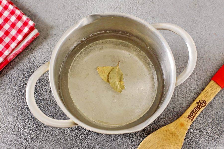 Приготовьте маринад. Для этого соедините воду, масло, соль и сахар. Добавьте лавровый лист, доведите до кипения и в самом конце влейте уксус.