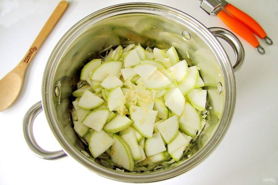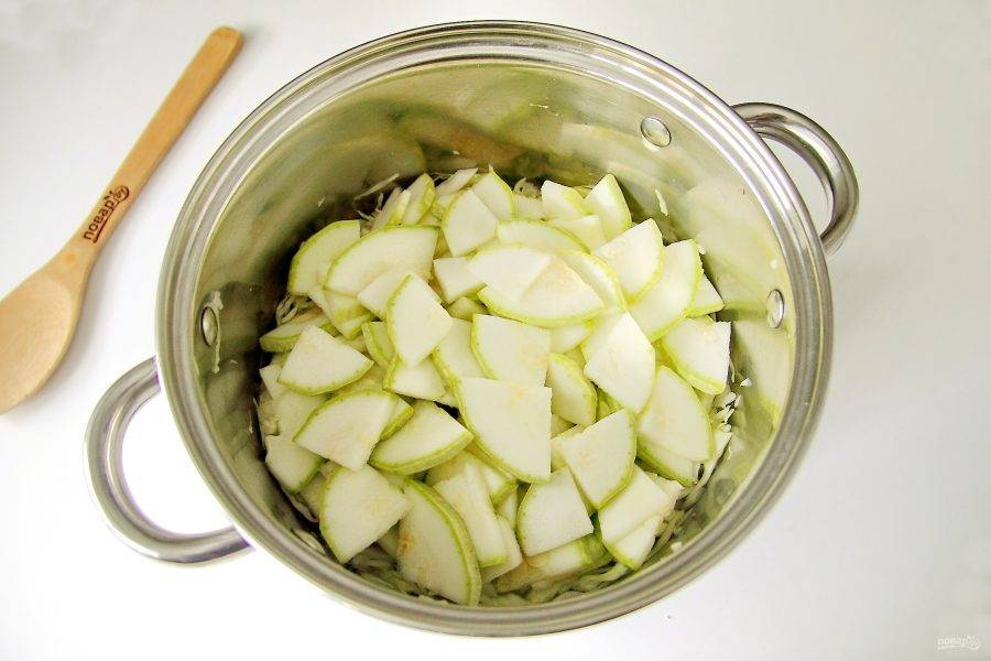 Кабачки вымойте и нарежьте кружочками. Затем каждый кружок разрежьте еще на 2-4 части. Если шкурка достаточно толстая, то ее предварительно нужно снять. Добавьте кабачки к капусте.