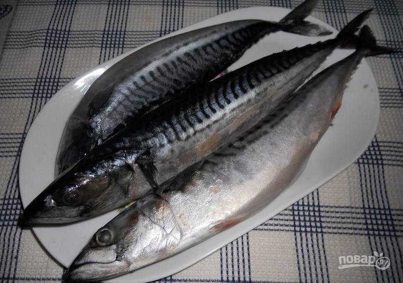 Рыбу разморозьте предварительно. Затем выпотрошите: отрежьте хвост и голову, удалите чёрную плёнку. Хорошо промойте скумбрию.