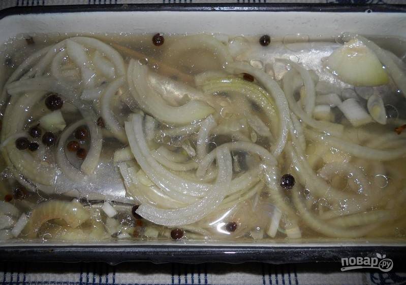 Теперь приготовьте маринад. Доведите до кипения воду. Добавьте в неё сахар, весь перец, гвоздику и соль. Перемешайте маринад до растворения сахара и соли. Остудите его. Затем добавьте масло и уксус, перемешайте. Лук нарежьте полукольцами. В ёмкость уложите скумбрию. На неё — лук, всё залейте маринадом.