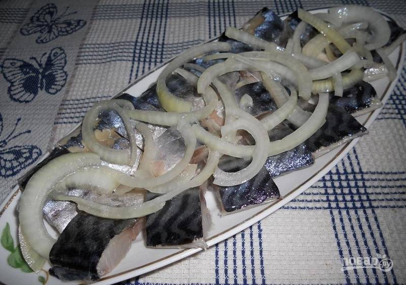 Готовую маринованную скумбрию подавайте с луком из маринада. Приятной дегустации!