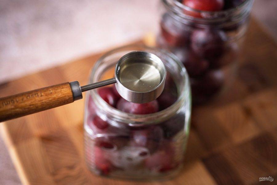 В каждую банку со сливами влейте по одной столовой ложке растительного масла.
