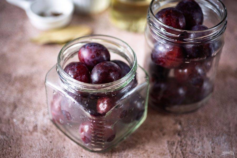 Банки для консервации и крышки простерилизуйте удобным способом. В простерилизованные баночки выложите сливы, по возможности плотно (не раздавливая при этом).