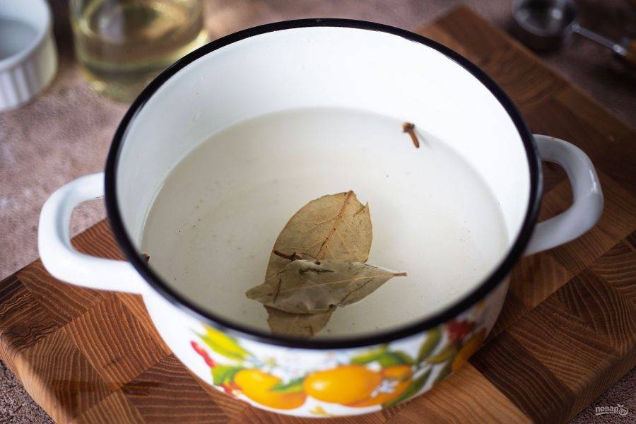 Через 5 минут воду слейте в чистую кастрюлю. В эту воду добавьте соль, сахар, гвоздику, лавровый лист. Доведите до кипения. Кипящий рассол залейте опять в банки со сливами и оставьте так на 5-6 минут. Слейте вновь рассол со слив в кастрюлю, доведите до кипения, добавьте уксус.