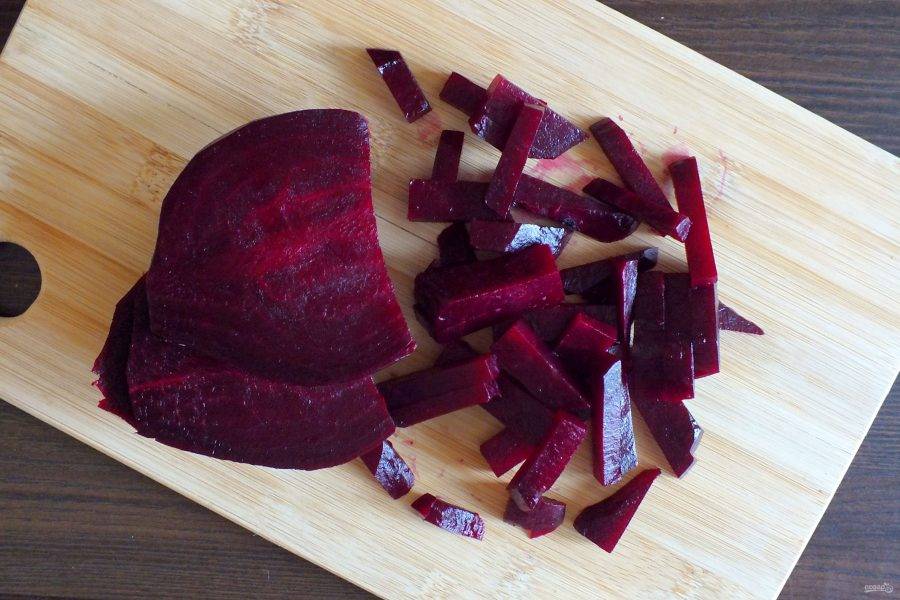 Очистите свеклу. Нарежьте на брусочки размером 3-4 см.