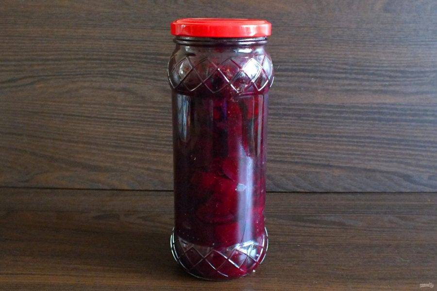 Влейте кипящий маринад. Закрутите крышкой. Покатайте банку по столу, чтобы маринад и уксус распределились. Оставьте банку на сутки при комнатной температуре. По истечении времени уберите на хранение в холодильник или в холодный погреб.