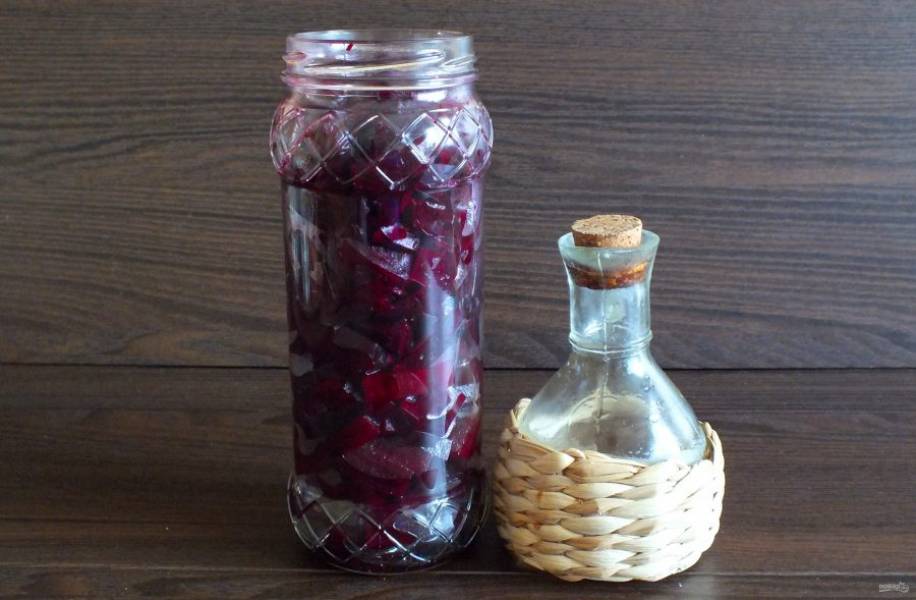 Нарезанную свеклу переложите в стерилизованную банку. Слегка утрамбовывая ложкой. Влейте столовую ложку уксуса.