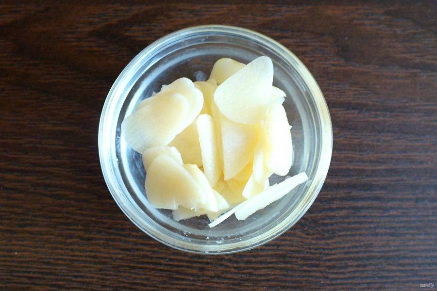 Чеснок очистите и нарежьте на тонкие пластинки.