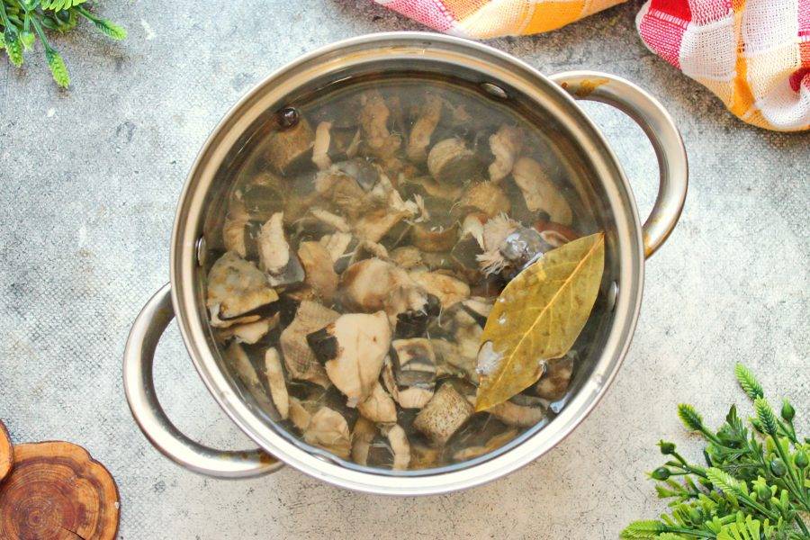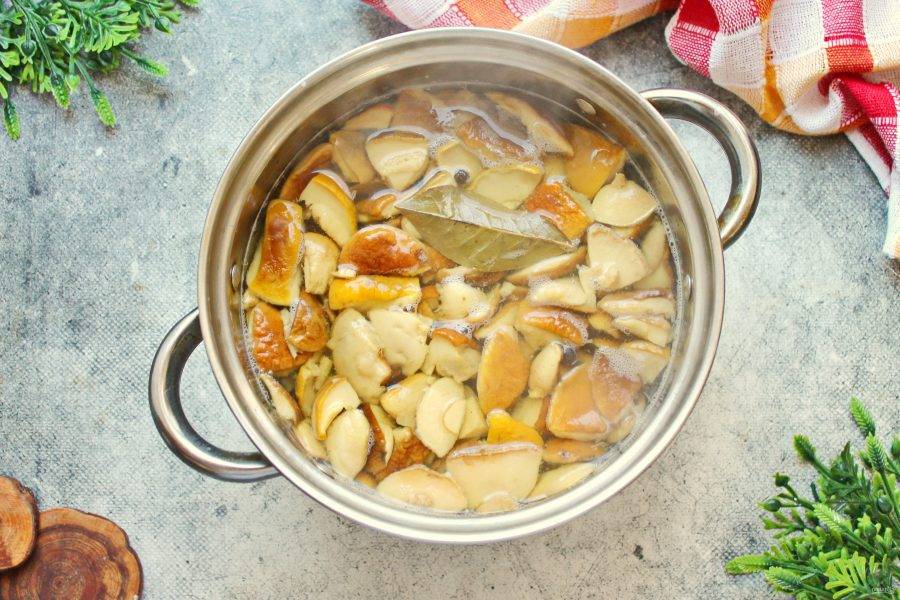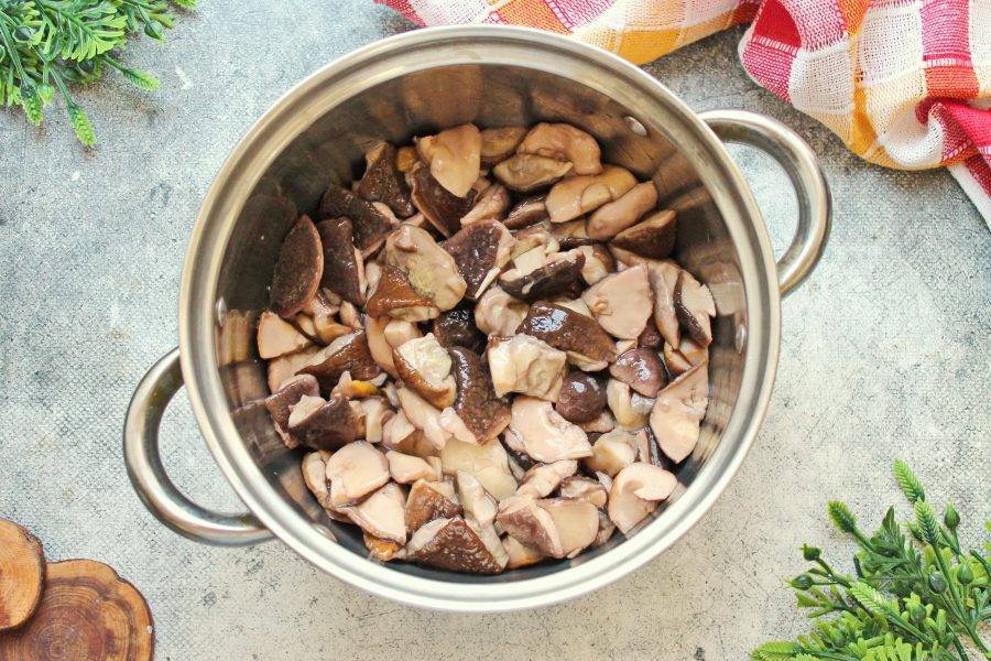 Маленькие белые грибы оставьте целиком, у крупных грибов отрежьте шляпки и порежьте их на средние куски. Ножки лучше всего использовать в других блюдах. Выложите грибы в кастрюлю и залейте водой. Посолите, чтобы вода была хорошо соленой. Поставьте на средний огонь и доведите до кипения. Убавьте огонь и варите в течение 30 минут, откиньте на дуршлаг и промойте холодной воде, дайте полностью стечь.