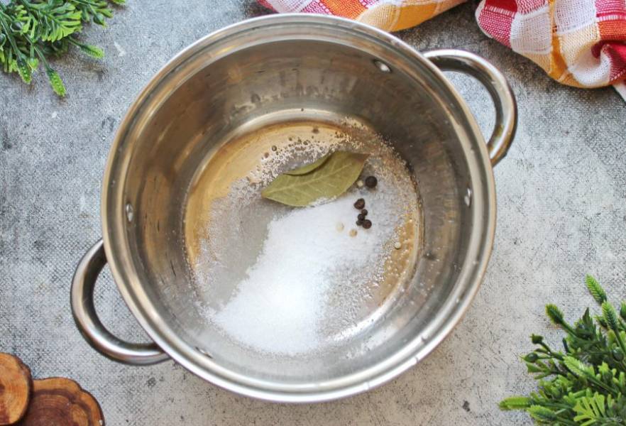 Пока сливается вода с грибов, приготовьте рассол. В кастрюлю выложите соль, сахар, перец, лавровый лист и чеснок. Влейте воду. Доведите все до кипения и готовьте 2 минуты.