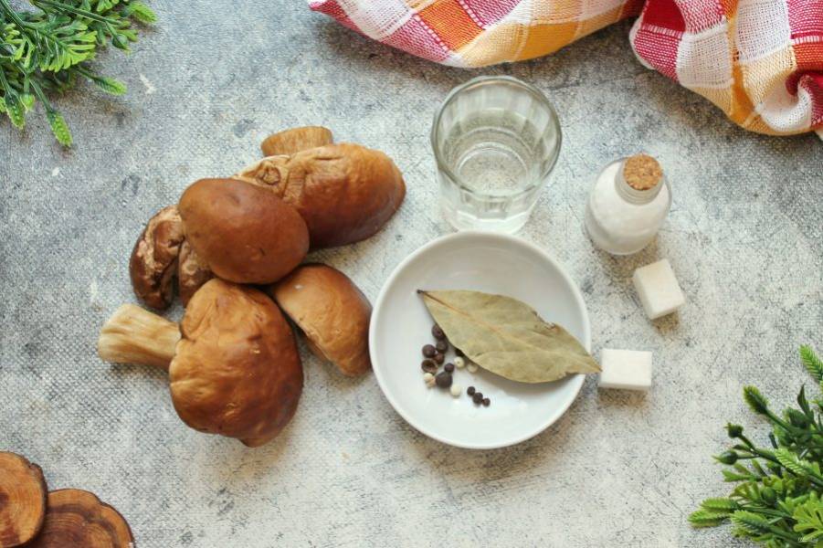 Подготовьте все необходимые ингредиенты для приготовления маринованных белых грибов. Грибы переберите, отрежьте слишком длинные ножки, уберите червивые и очистите от сора. Сполосните холодной водой или хорошо промойте от грязи и песка.