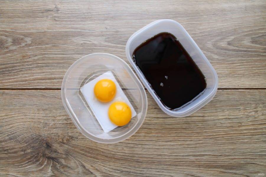 Отделите белки от желтков, выложите желтки в миску, белки нам не понадобятся. В другой миске смешайте соевый соус и рисовый уксус.