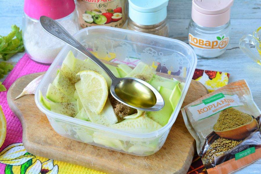 Влейте к кабачкам яблочный уксус, растительное масло и лимонный сок.
