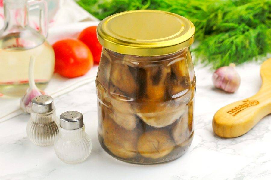 Ошпарьте банку и крышку кипятком или простерилизуйте другим удобным способом. Выложите в банку грибы и залейте маринадом до верха.