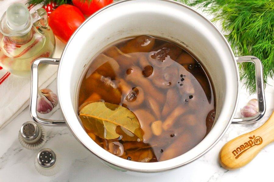 Влейте кипяток и отварите маслята примерно 15-20 минут на среднем нагреве, чтобы они не потеряли свою форму. Влейте уксус и отварите еще 1-2 минуты. Благодаря уксусу, жидкость станет более прозрачность.
