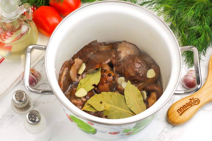 Снова выложите грибы в кастрюлю, добавьте лавровые листья, горошины черного перца и нарезанный слайсами чеснок. Помните, что лавровые листья обязательно нужно будет удалить перед закатыванием маслят в банки.