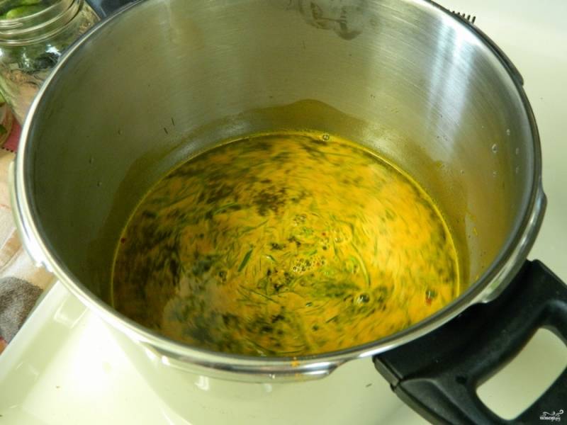 На следующий день обсушите огурцы, но не промывайте их. В отдельной кастрюле смешайте все остальные ингредиенты, кроме лука, чеснока и огурцов. Доведите до кипения, маринад готов!