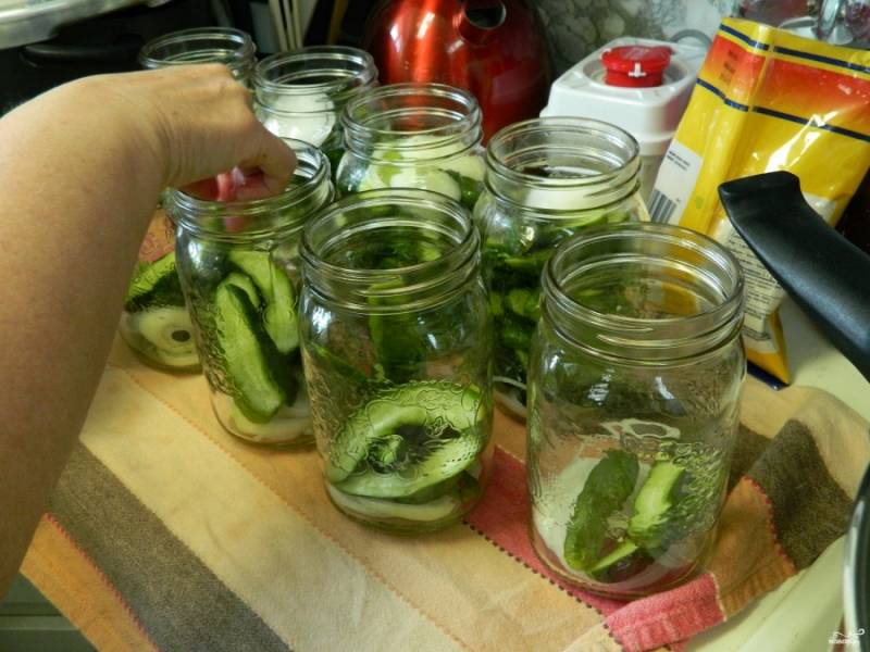 Разложите огурцы, порезанный дольками, лук и зубчики чеснока по стерилизованным банкам.